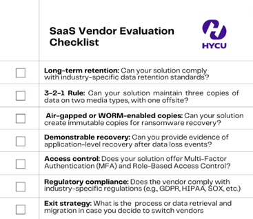 In comparison to on-premises solutions, where customers control their data, SaaS solutions must meet higher standards in data governance, retention, and recoverability. In fact, here is a checklist HYCU provides to our own enterprise customers to make sure they select the right SaaS vendor based on critical data protection requirements.