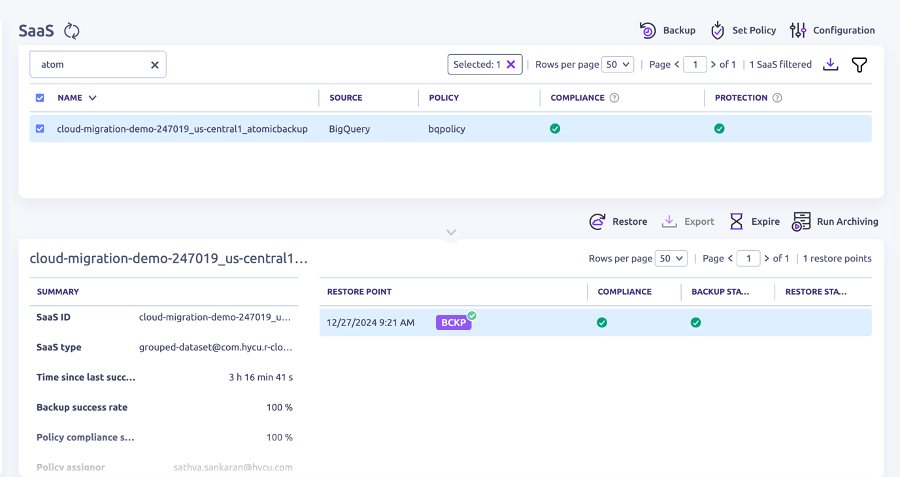 Die Innovation für BigQuery geht noch einen Schritt weiter: HYCU unterstützt jetzt Atomic Backup Sets für BigQuery. Atomic Backup Sets wurden entwickelt, um konsistente Ansichten und Abfragen von Daten zu gewährleisten, die über mehrere Datensätze in BigQuery verteilt sind. Ganz gleich, ob es sich um abhängige Datensätze aus verschiedenen Quellen oder um Querverweise von Ansichten über verschiedene Datensätze hinweg handelt, Unternehmen sind jetzt viel länger als das einwöchige Zeitreisefenster, das BigQuery-Benutzern zur Verfügung steht, mit einer konsistenten Kopie vor Datenverlust geschützt.