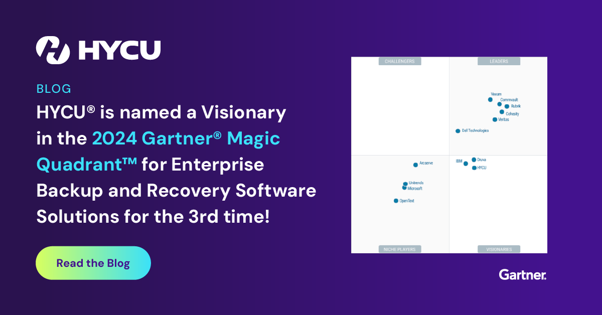 Today, HYCU was recognized as a Visionary in the 2024 Gartner Magic Quadrant for Enterprise Backup and Recovery Software Solutions.