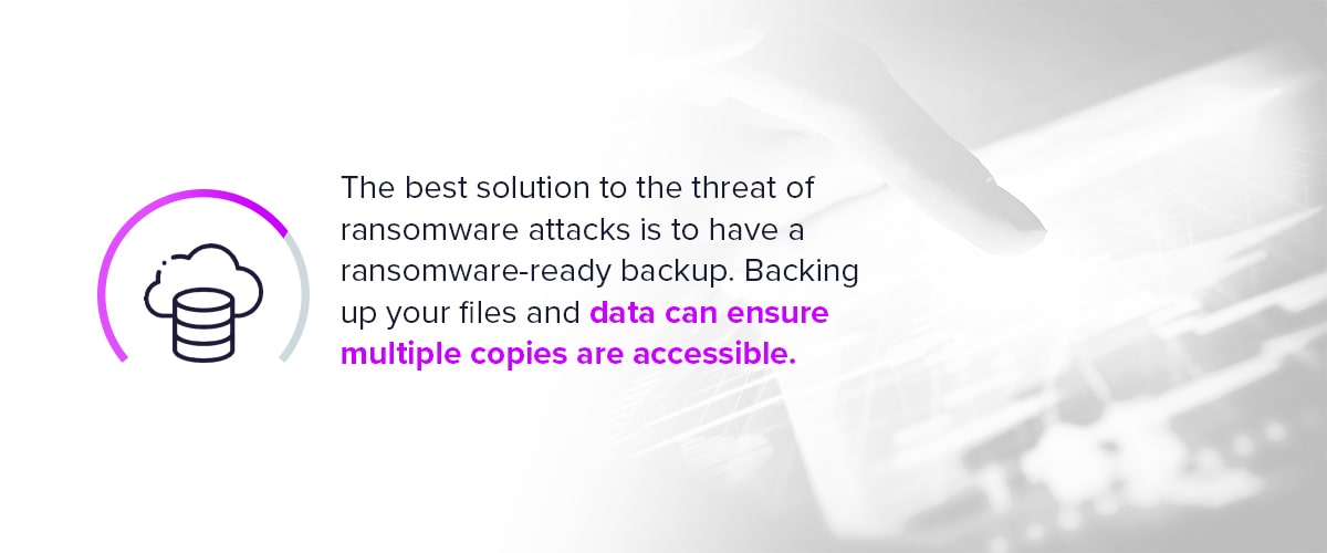 The best solution to the threat of ransomware attacks is to have a ransomware-ready backup. Backing up your files and data can ensure multiple copies are accessible. Even if the original file becomes compromised, companies can access their critical information through the copies. Backups enable organizations to continue their operations and remove the pressure to pay the ransom.