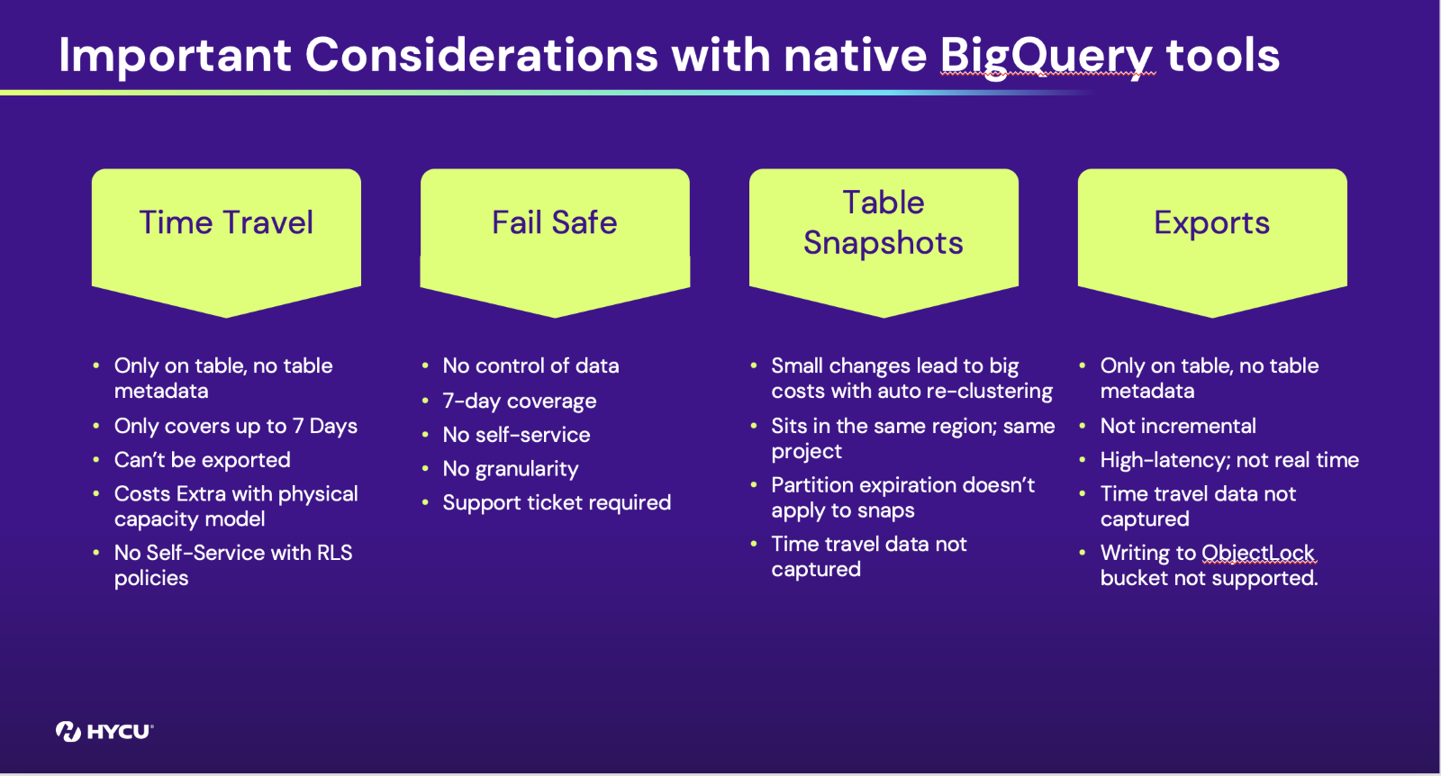 By understanding and addressing each myth, you have a blueprint to develop a robust backup and recovery strategy for your BigQuery data. This in turn will ensure BigQuery data is available and you maintain data integrity in any situation. HYCU® R-Cloud™ offers the most comprehensive backup solution for BigQuery and we are here to help as you work to address your needs. HYCU R-Cloud protects not only table data, but also metadata, functions, routines, views, row level security policies and much, much more. And it doesn’t just end with simple backups for BigQuery data. HYCU R-Cloud uniquely offers ransomware resilience through atomic backup that enable consistency across backups of multiple datasets through Object Lock, cross-region & cross-project protection and cold line storage archiving.