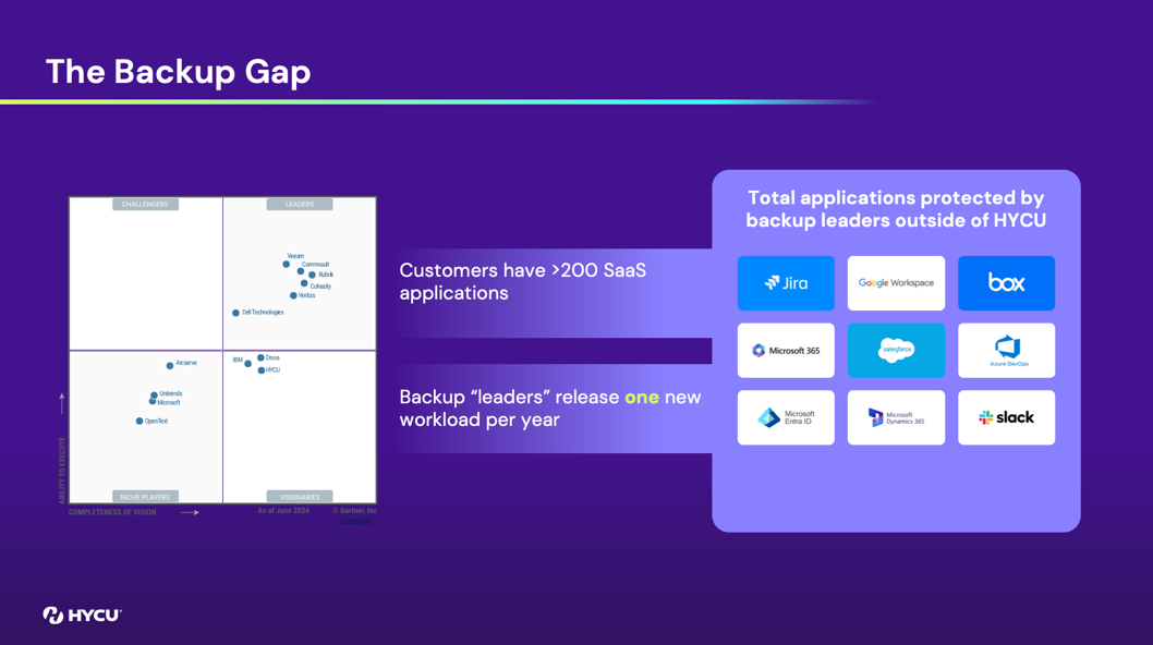 Outside of HYCU, the rest of the backup vendors recognized in the Gartner Magic Quadrant protect at most ten total SaaS applications. However, the average midsize organization manages well over 200 SaaS applications, and with more than 30,000 as-a-service ICTs, the gap is huge.
