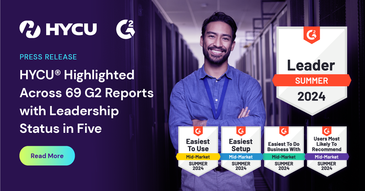 Boston, Mass., July 2, 2024 – HYCU, Inc., a leader in data protection as a service and one of the fastest growing companies in the industry, announced HYCU was acknowledged as a leader by G2, the world’s largest and most trusted software marketplace, in five reports including Grid® Report for SaaS Backup | Summer 2024, Grid® Report for File Recovery | Summer 2024, Grid® Report for Disaster Recovery as a Service (DRaaS)| Summer 2024, Grid® Report for Server Backup | Summer 2024, and Grid® Report for Database Backup | Summer 2024, and highlighted across more than sixty other reports including backup, migration, recovery, and data protection.
