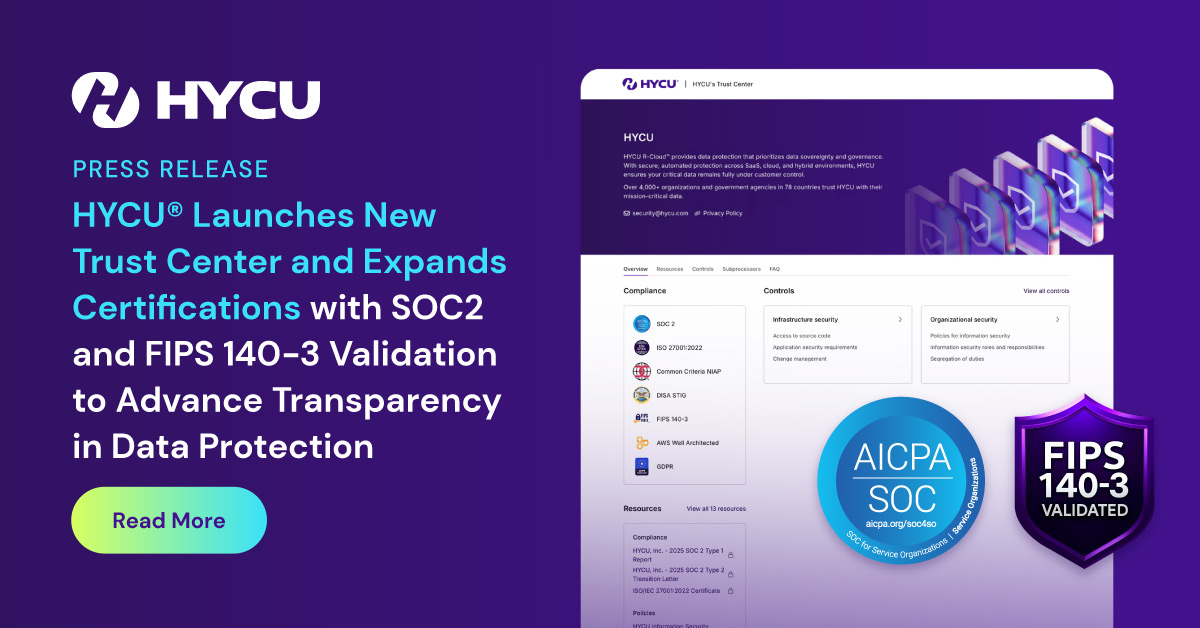 HYCU® Launches New Trust Center and Expands Certifications with SOC2 and FIPS 140-3 Validation to Advance Transparency in Data Protection