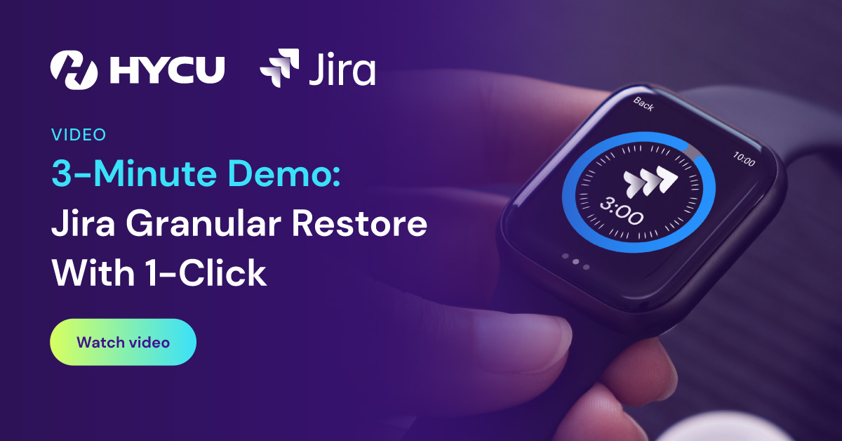 In this 3-minute explainer, our protection experts demonstrate how HYCU’s 1-click granular restore for Jira ensures your data is never lost. Learn how you can recover projects, issues, or attachments quickly and seamlessly—without the need to restore an entire instance.