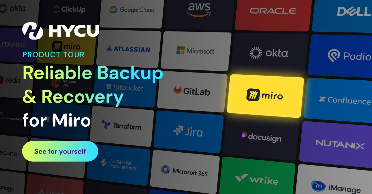 HYCU’s Miro backup and recovery solution keeps your workshops, brainstorming boards, and diagrams protected. Restore boards, sticky notes, or structures with just a few clicks.
