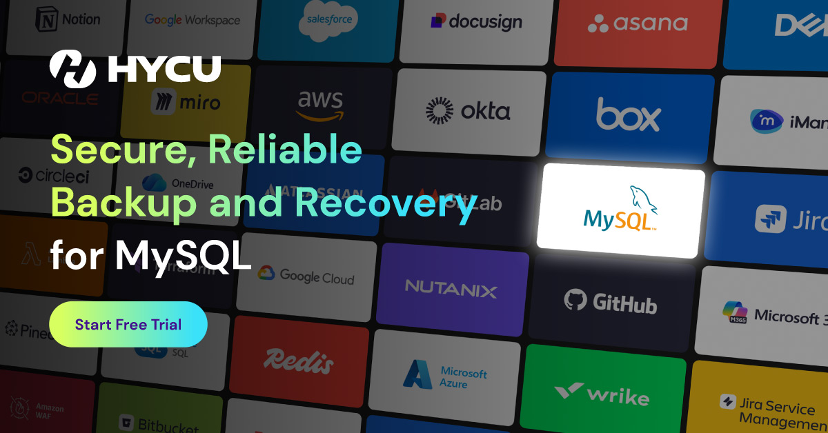 HYCU performs application-aware, agentless backup and enables fast, point-in-time restore for MySQL databases.